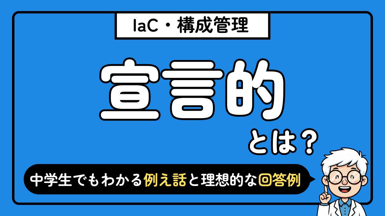 レシピを例にしましょう。命令的なレシピは「卵を割って混ぜて、牛乳を加えて…」と手順を細かく指示します。宣言的なレシピは「オムレツを作りたい」と結果だけを伝えるようなもの。システム構築では、「最終的にどういう状態にしたいか」 を記述する方式を指します。